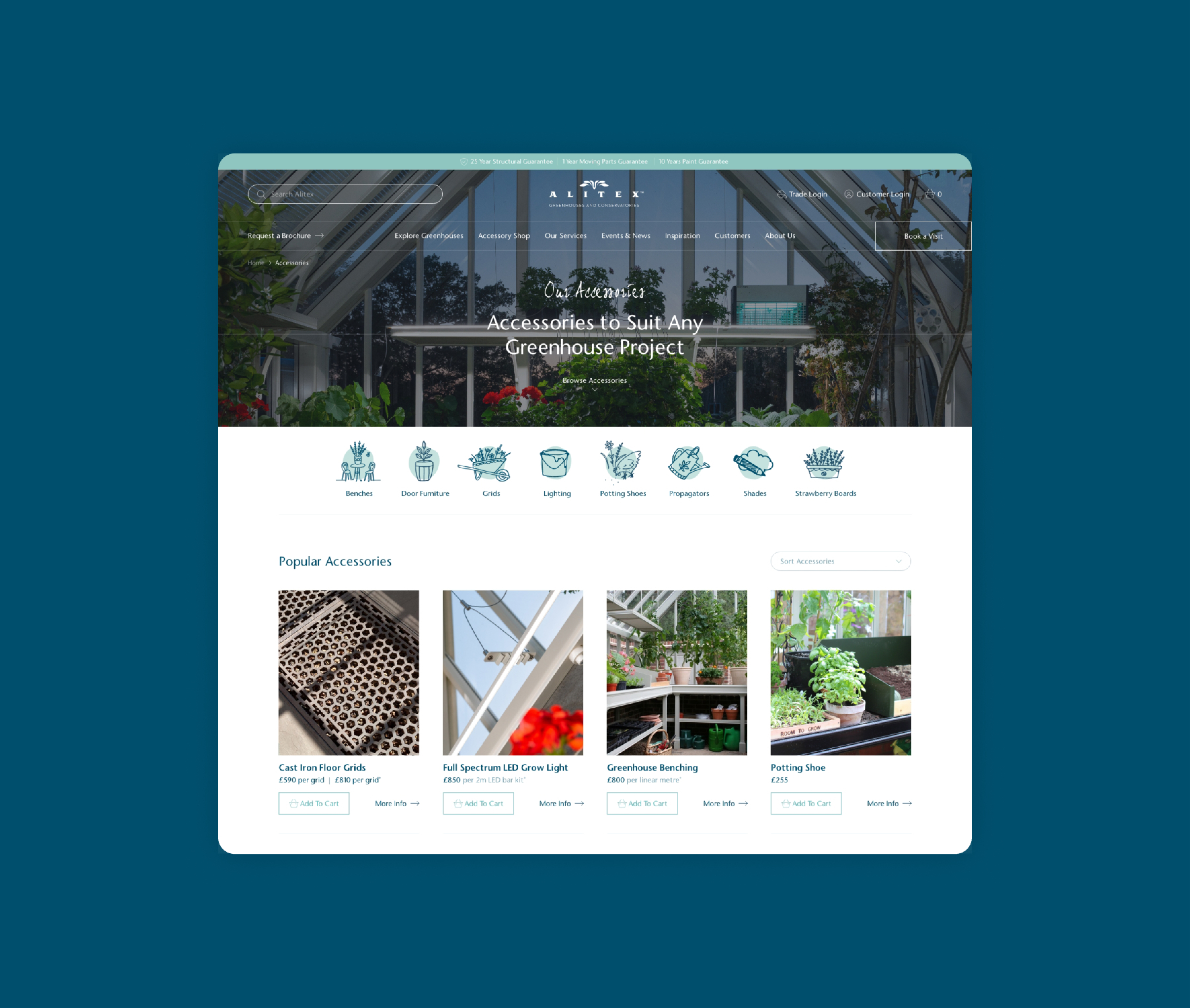 The new website is helping Alitex to achieve their primary goal of inspiring potential clients. The site’s clean and contemporary layout, combined with the heavy use of visuals, allows visitors to imagine themselves in one of Alitex’s beautiful and bespoke greenhouses. The ecommerce functionality and considered UI also makes it simple for clients to browse, select and enquire about products directly from the website.